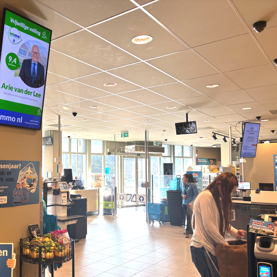 Albert Heijn Europakwartier trekt zo’n 60.000 bezoekers per maand. Drie schermen in het kassapark zijn prominent zichtbaar voor iedere bezoeker, waardoor dit een ideale plek is voor lokale ondernemers om hun naamsbekendheid te vergroten.